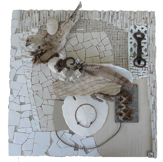 53cm x 53cm square. Macro- to micro-cosmos. From a multitude of materials collected throughout time and countries.