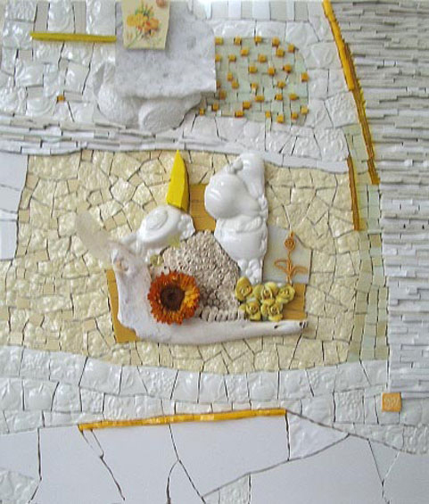 the mosaic technique like a painter, mixing and juggling the surfaces