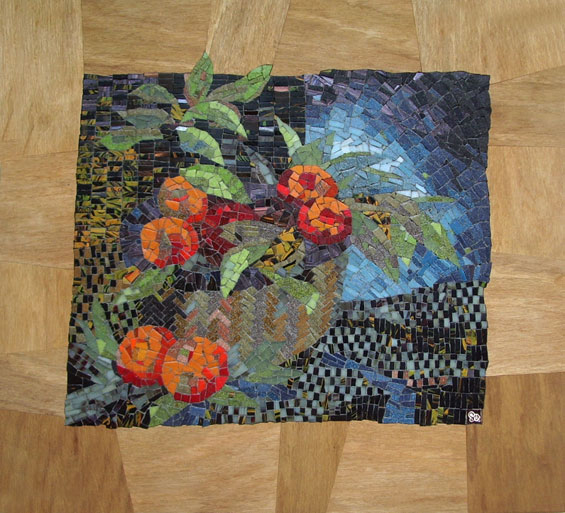 Working on these still lives, using this very traditional theme of a bowl of fruit with one light source, using tiny cuts of glass as stitches like embroidery,