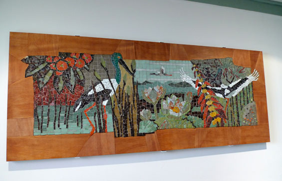 The aqua blues suit perfectly the glass kitchen counter splashback and the many browns echo the colour of the slate floor.