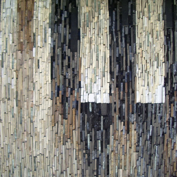 Glass, marbles, travertines, stones. All the tiles are placed on their side edge giving a ragged texture.