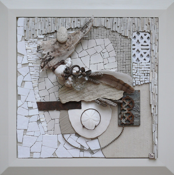 Abstract landscapes viewed as micro- and macro-cosmos. Materials for assemblage gathered through times and countries. Sun-bleached animal bones, wood, shells, stones, feathers, plates, ceramic, glass, abandoned industrial rusty scraps of metals and man-made precious jewellery.