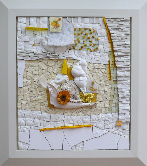 Textured mainly white tableaux with a colour piercing through. Abstract landscapes viewed as micro- and macro-cosmos. Materials for assemblage gathered through times and countries.