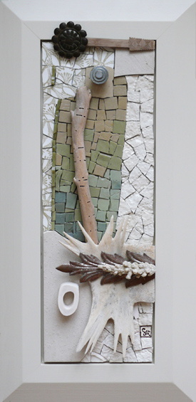 Abstract landscapes viewed as micro- and macro-cosmos. Materials for assemblage gathered through times and countries. Sun-bleached animal bones, wood, shells, stones, feathers, plates, ceramic, glass, abandoned industrial rusty scraps of metals and man-made precious jewellery.